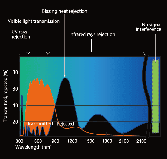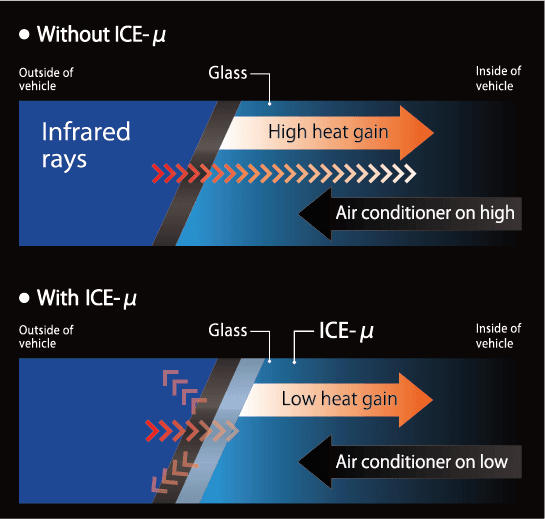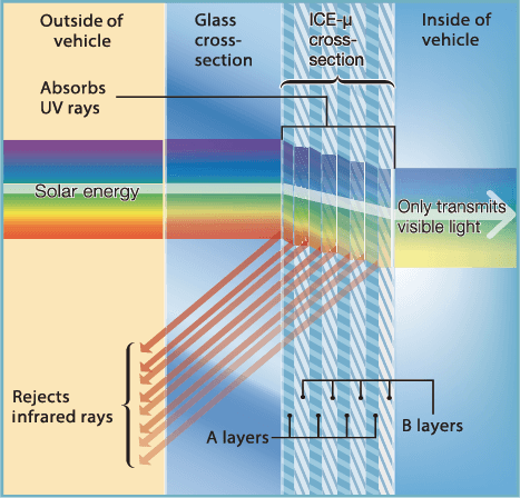 창문을 통해 빛을 제어하고 자외선, 적외선 및 대부분의 열을 차단함으로써 ICE-μ는 차량 내부의 열과 에어컨의 필요성을 크게 줄일수 있습니다.